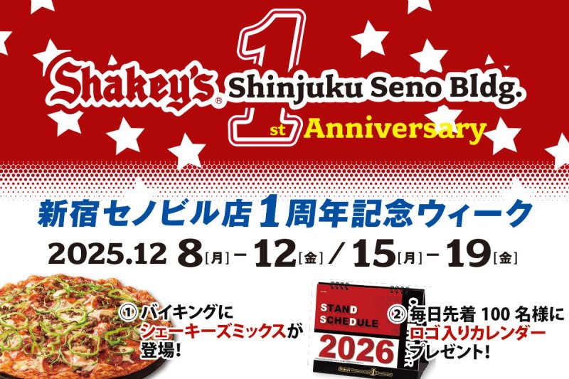 The first 100 people will receive a calendar with the 1st anniversary logo of the Shakey's Shinjuku Seno Bldg. store every day.